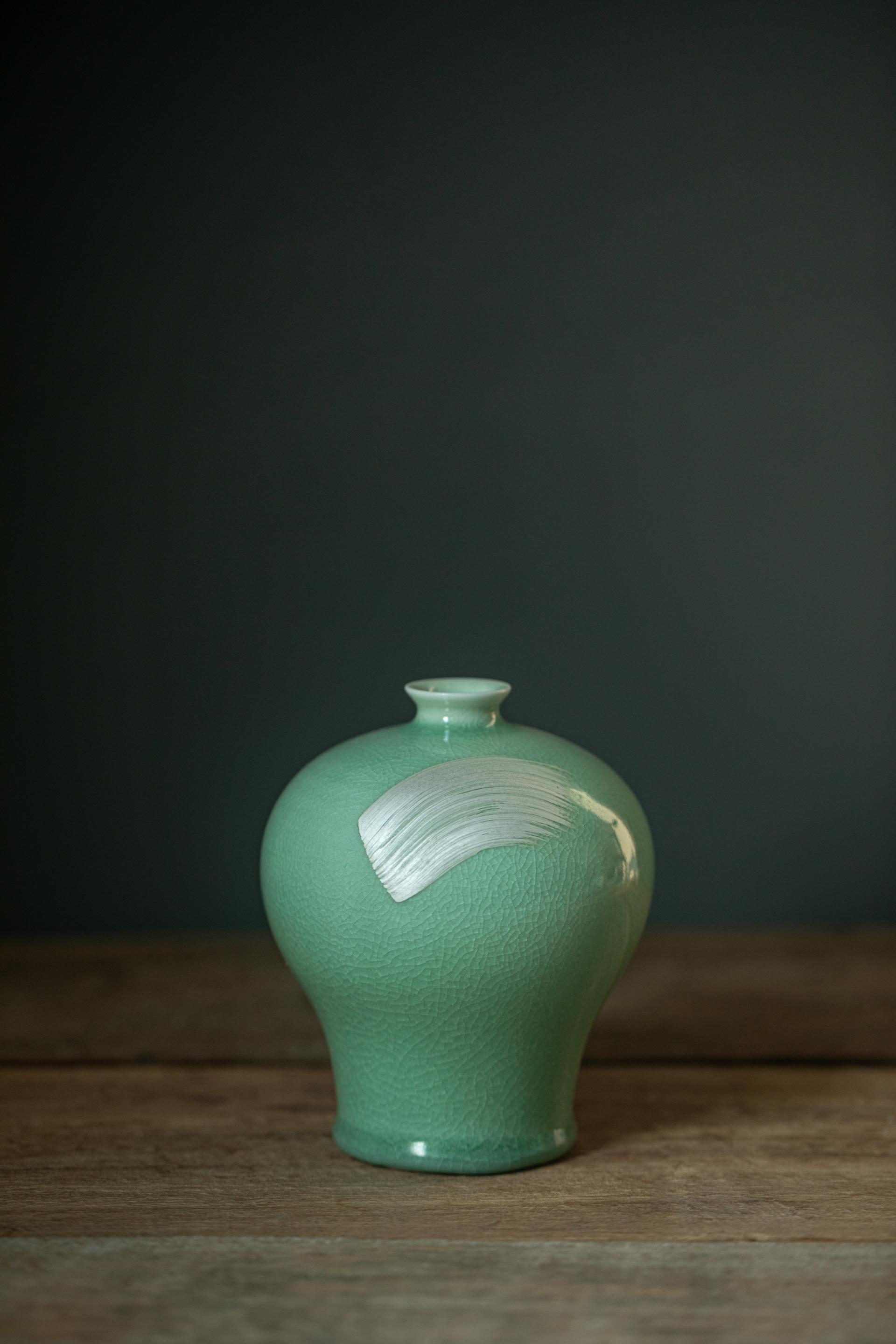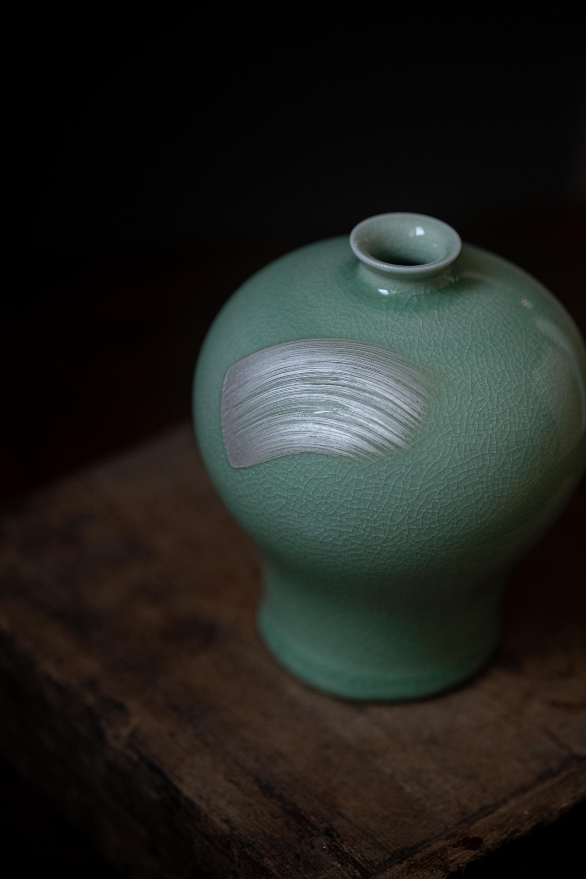 은빛 붓터치를 얹은 청자 매병입니다.